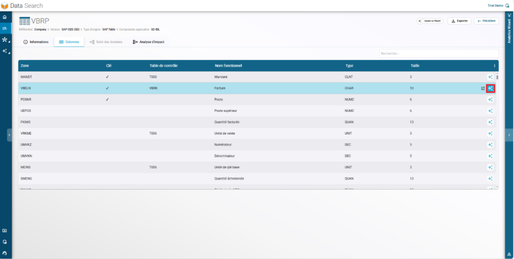 Sur le BI Smart Repository, il est possible de sélectionner les champs et les tables SAP qui vous intéressent. Ces champs peuvent venir de votre connaissance métier (ex : numéro de facture, type de document, montant HT, client, devise…), ou simplement de ce que vous souhaitez analyser dans votre futur rapport.