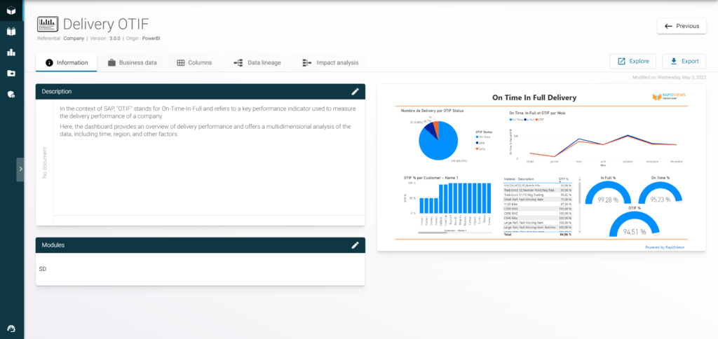 Cliquez sur un objet pour accéder à une vue détaillée de ses informations. Découvrez son contenu, ses métadonnées, ses dépendances et son utilisation dans l’environnement BI. Cette transparence totale vous permet de comprendre le rôle de chaque élément et d’optimiser vos analyses sans risquer d’utiliser des données obsolètes ou incorrectes.